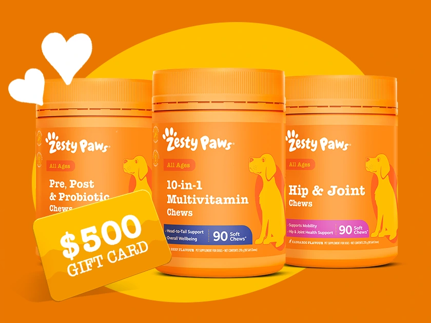 Major Prize (1 winner): “Ultimate PALentine’s Gift” valued at up to AUD$1,369.88, including a $500 Visa Gift Card, 12 x Zesty Paws 90ct Soft Chews (winner’s chosen variety, delivered quarterly), and Zesty Paws merchandise.
